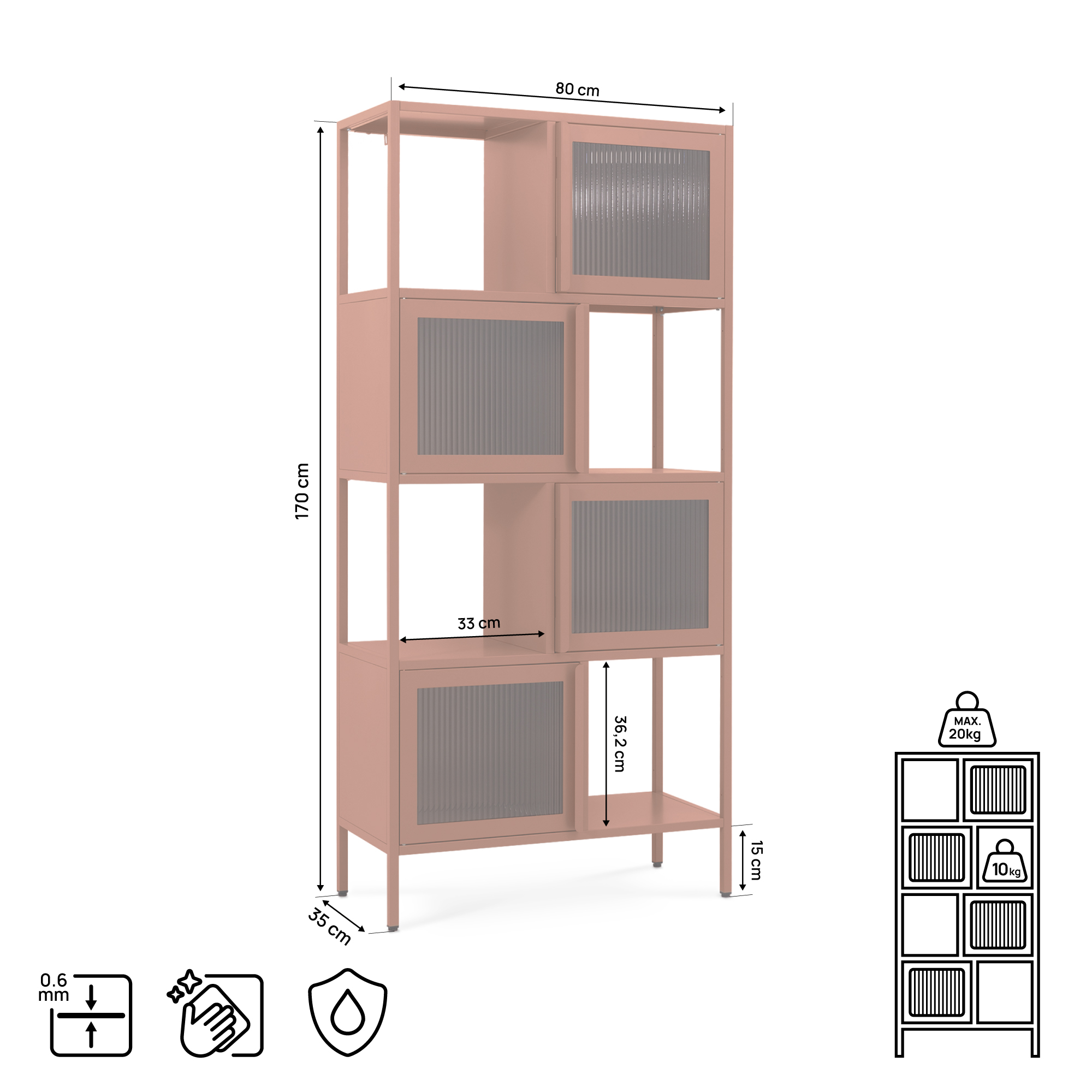 Kovový regál KIARA, výška 170 cm, 4 dvere, 4 výklenky, terakotové a ryhované sklo
