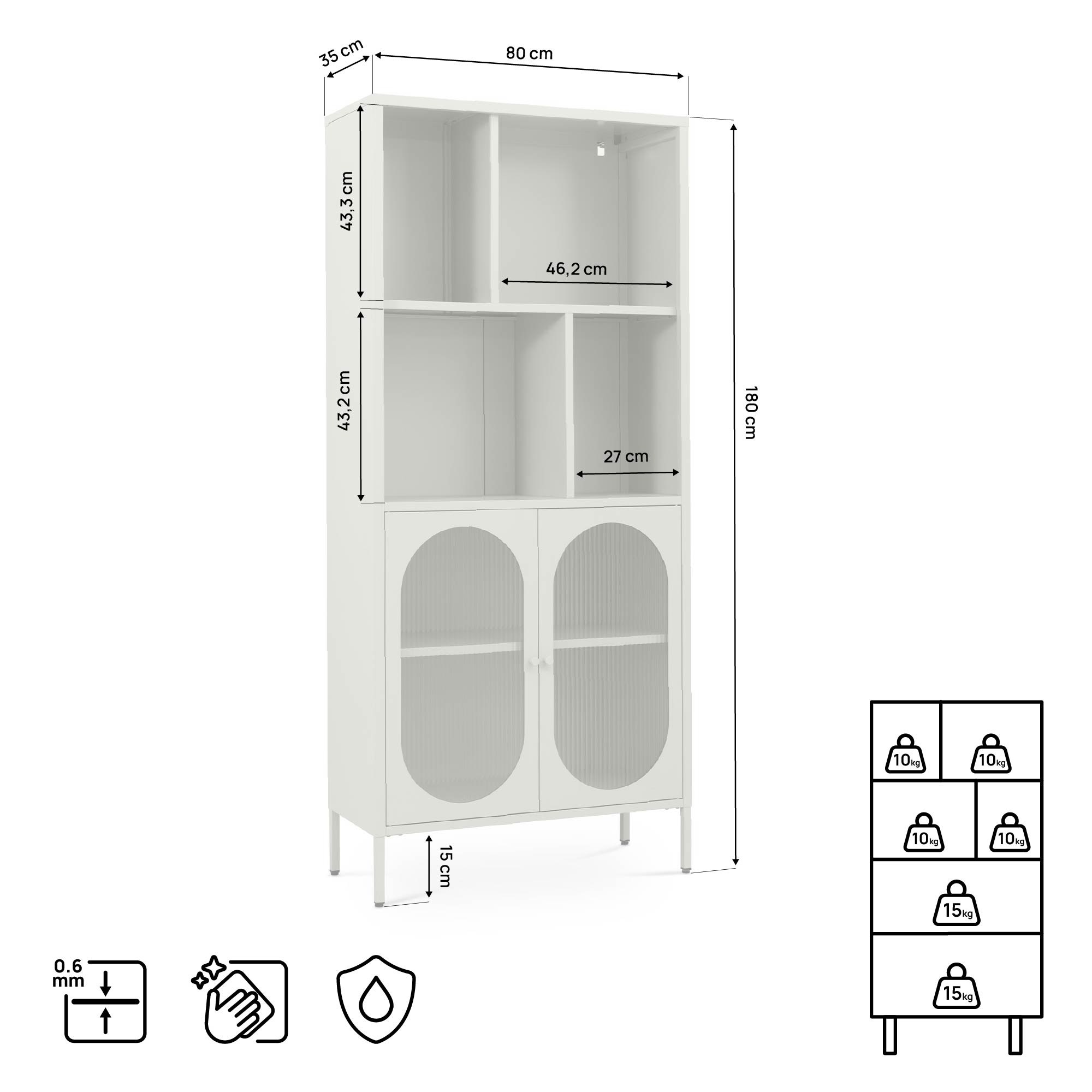 Tento kus nábytku kombinuje pevnosť kovu s priehľadnosťou drážkovaného tvrdeného skla, čím vytvára kontrastný a charakteristický vzhľad. Kov zdôrazňuje priemyselný a moderný vzhľad, zatiaľ čo tvrdené sklo dodáva lesk a ľahkosť. Dokonalá kombinácia pre štýlovú, odolnú a elegantnú miestnosť.