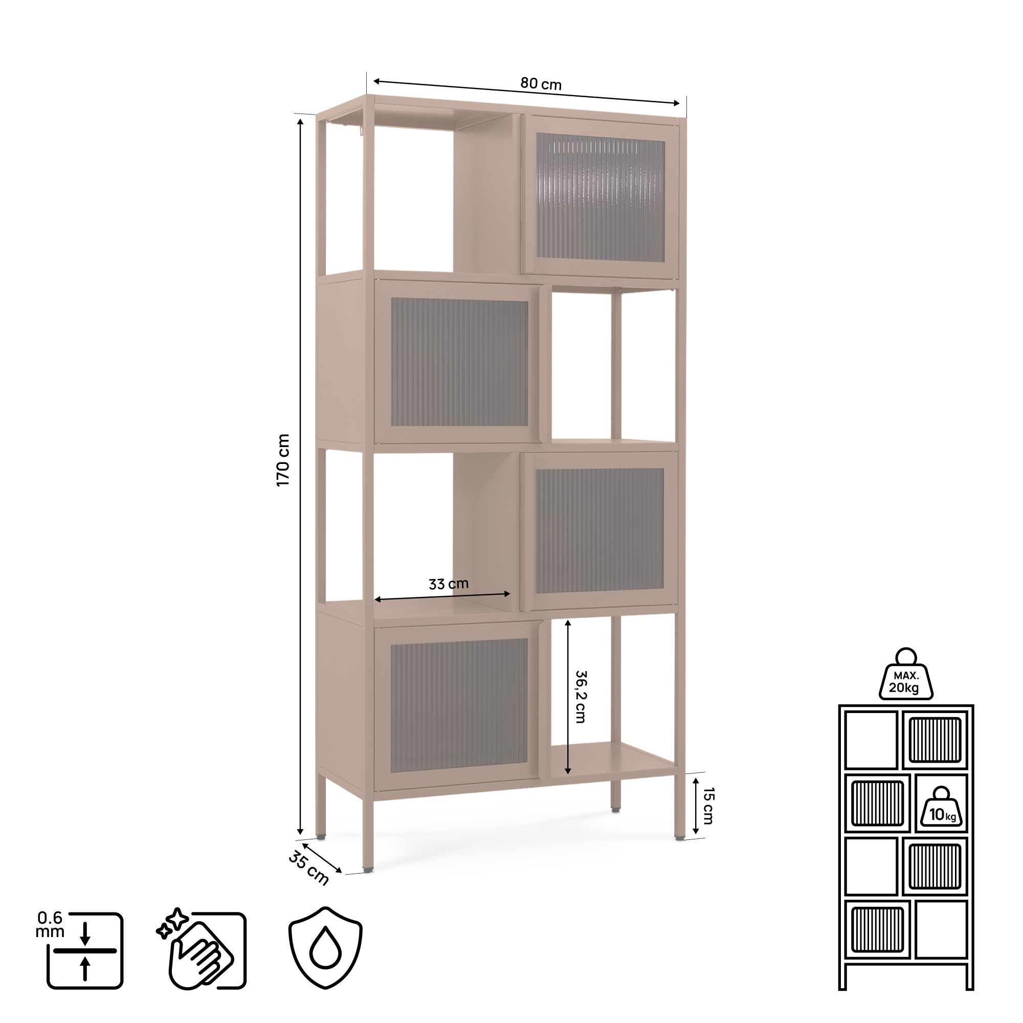 Priemyselný regál KIARA, výška 170 cm, 4 dvere, 4 výklenky, hnedé a ryhované sklo